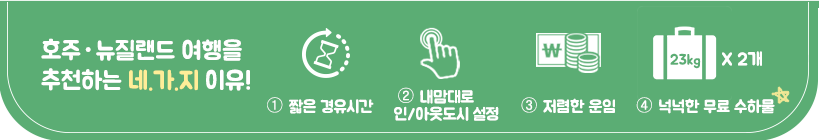- 각 구간별 성수기(호주 7.7-7.30, 뉴질랜드 4.20-5.1, 7.7-7.30, 9.28-10.8)기간은 프로모션 대상에서 제외됩니다.