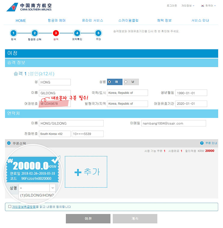 STEP 3. 승객 정보 입력 페이지 > 쿠폰선택 > 성명 선택