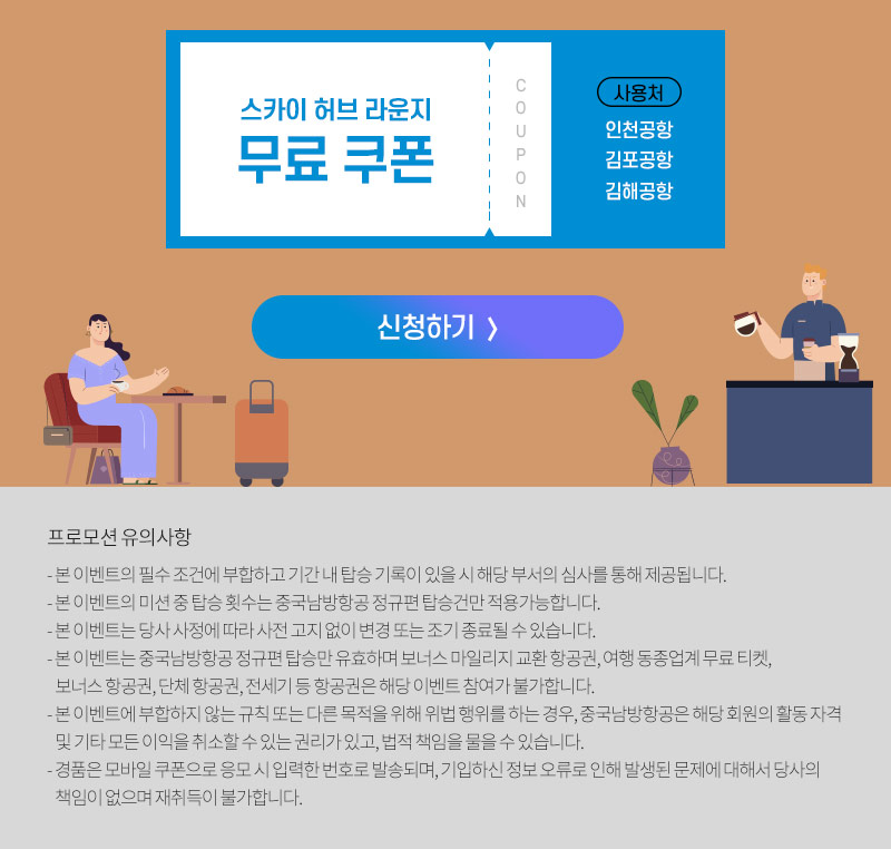 중국남방항공은 보다 원활한 서비스 제공을 위하여 이벤트 응모 시 필수항목 정보를 수집하고 있습니다. 필수항목 정보는 이벤트 진행 시 활용되는 정보로서 원치 않을 경우 수집하지 않으며, 동의 거부 시 이벤트 참여에 제한을 받을 수 있습니다.