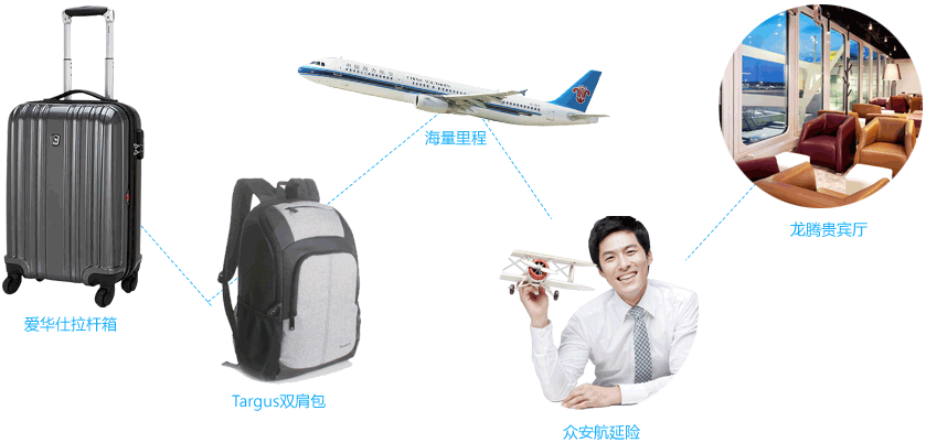 办理南航广州银行联名卡,爱华仕拉杆箱、Targus双肩包、海量里程、众安航延险、龙腾贵宾厅