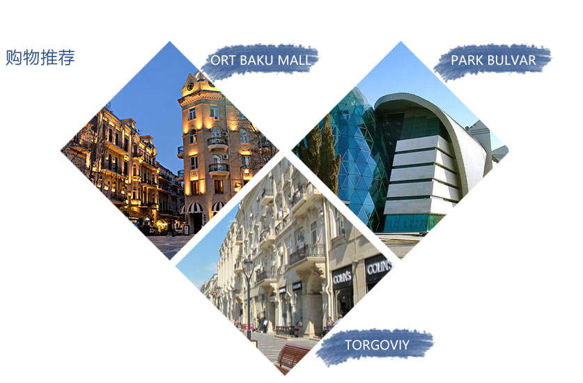 PARK BULVAR:位于里海海滨步行大道旁,在著名的"大国旗"景点附近,比邻希尔顿、万豪等国际酒店,商场地下设有停车场,连锁超市BAZARSTORE,楼上各层设有服装店、餐饮广场、书店、电影院,是巴库主要的休闲、购物综合体之一。