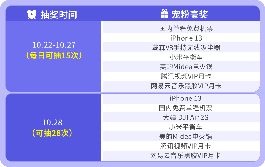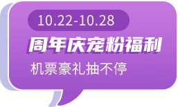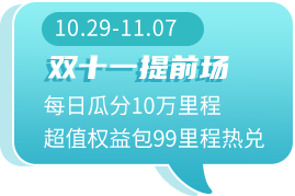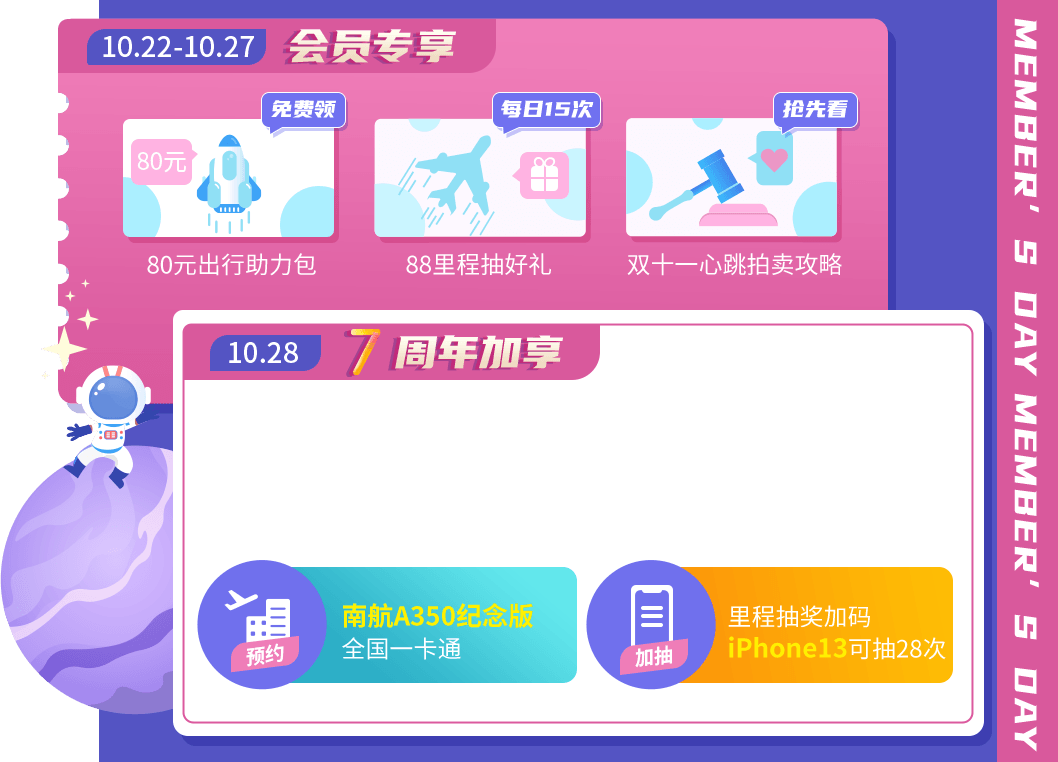 新会员福利:10月22日-10月28日会员日期间入会的新会员,可免里程参与1次抽奖。