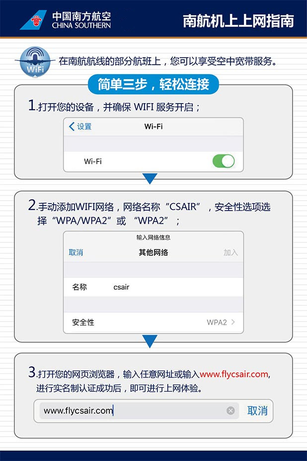 4、如遇航班机型调整、设备维护、系统升级、设备兼容性等原因,上网服务均可能无法提供。请以实际航班情况为准,航空公司不再另行通知旅客,亦不提供补偿。