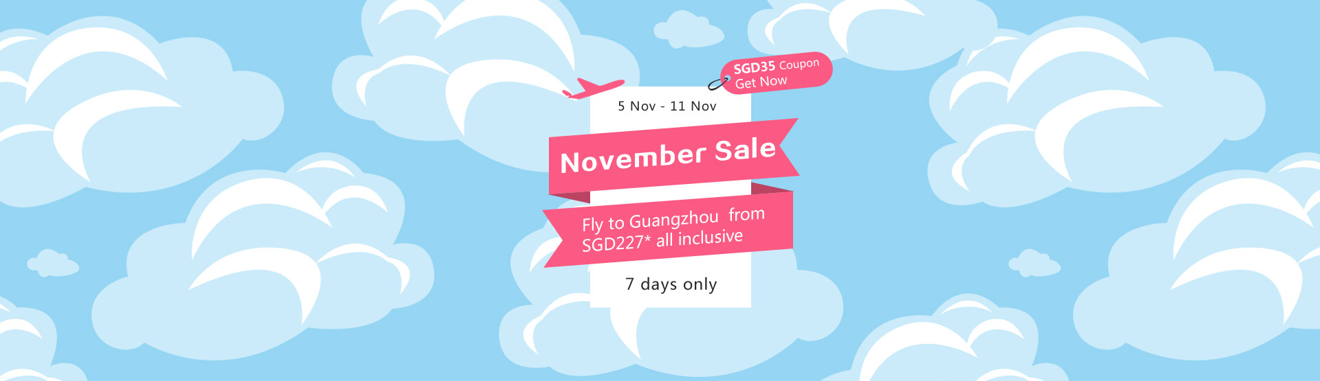 6. This SGD35 coupon can only be used when purchasing an international flight of SGD175 value or above from China Southern Airlines (excluding taxes and fees).