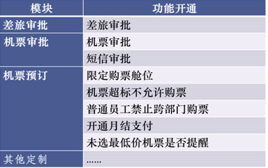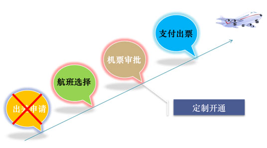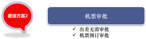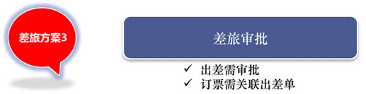 差旅方案应用案例:在业务部门能否出差需要业务部门审批。实现出差整合。在财务部门可对于超过标准的机票或所有机票进行机票审批,实现成本控制。