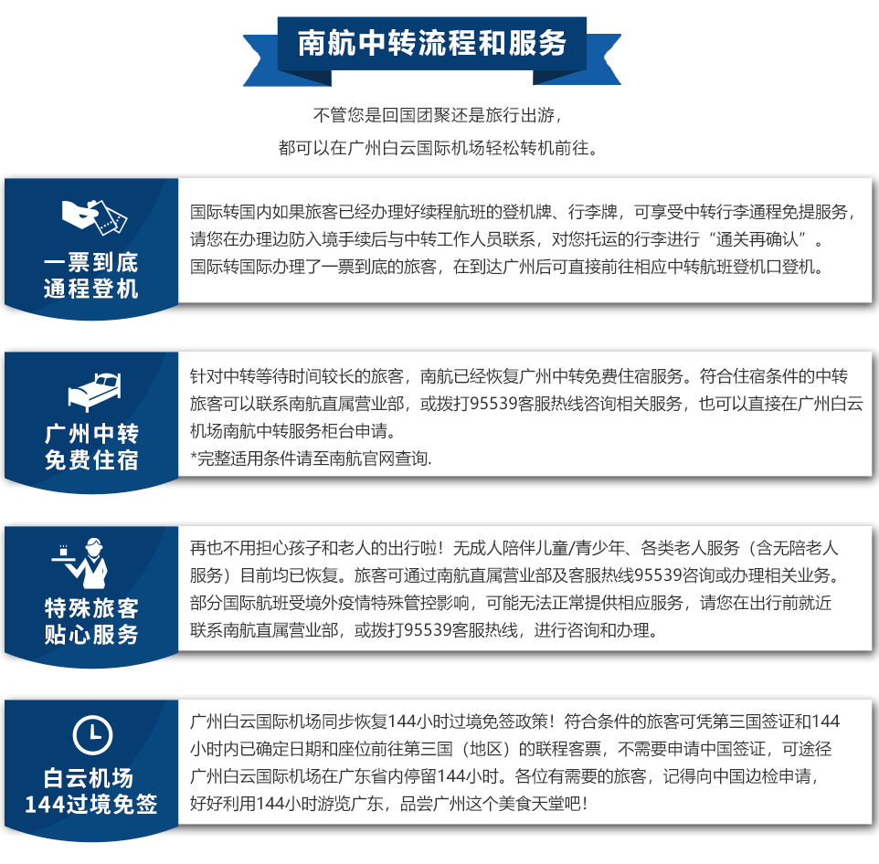 具体出入境政策请提前咨询中国出入境管理部门,更多有关中转流程和服务的信息,请前往南航官网查看: