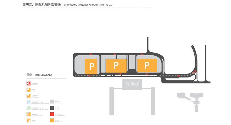 重庆江北国际机场T3航站楼停车场位于综合交通枢纽内,共设停车位约5000个。