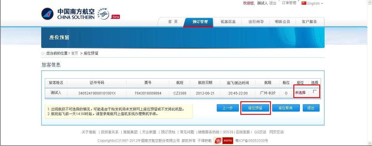 旅客在登录之前请仔细阅读“南航网上座位预留条款” ,如有疑问请联系南航电子商务 020-95539。
