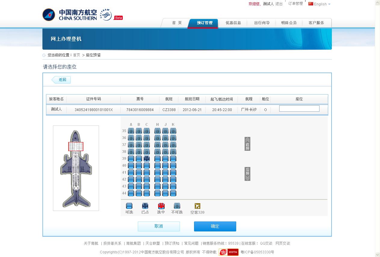 旅客在此座位图上选择喜欢的座位,然后点击“确定”按钮。