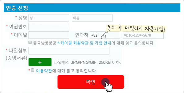 성명/여권번호/이메일/연락처 입력 및 증빙서류 첨부한 후 확인 버튼을 클릭해주세요.