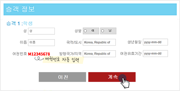 여권번호 자동 입력 여부 확인 후 필수 정보를 입력하여 예약을 계속하세요.
