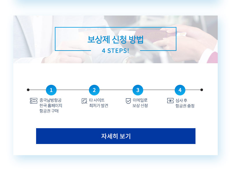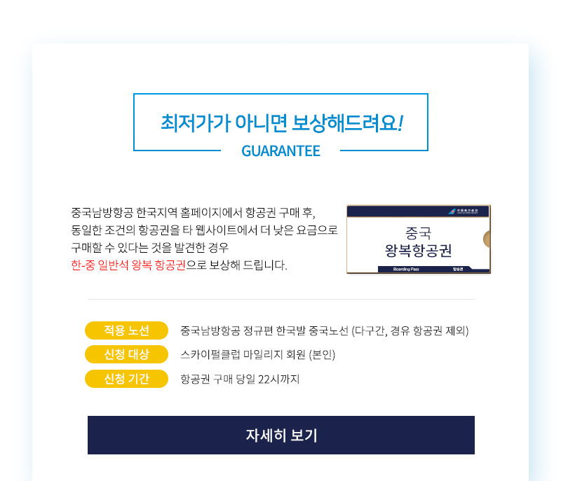 1. 보상제는 중국남방항공 한국홈페이지에서 구매한 항공권에 한하여 적용됩니다. 2. 다음 조건에 부합해야 보상제 검토 대상에 포함됩니다. ∙ 한국지역 국내 여행사 사이트보다 요금이 높은 경우 ∙ 동일한 편명/탑승일자/예약클래스 ∙ 동일한 결제조건: 카드 할인 및 기타 할인 쿠폰이 미적용 된 성인일반가 ∙ 좌석이 확약되어, 결제금액 및 결제 가능여부가 확인되는 경우 3. 다음의 경우는 보상제 검토 대상에서 제외됩니다. ∙ 국내가 아닌 해외 여행사 사이트 (e.g. Go to gate, Trip.com, Expedia 등) ∙ 국내 여행사 카드 할인 및 기타 할인쿠폰이 적용된 요금 ∙ 제공 스크린샷이 불분명하거나 위조로 판단되는 경우 ∙ 구매 당일 출발하는 항공권 ∙ 환율로 인한 항공권금액 차이 4. 조건에 모두 부합하는 경우, 한-중 왕복항공권 일반석(확약) 1장을 제공해 드립니다. 5. 보상으로 제공되는 항공권은 기존 구매하신 항공권으로 탑승 완료 후, 해당 항공권이 보상 신청 당시 제출하셨던 편명과 탑승일자가 동일해야만 최종 지급됩니다. 6. 항공사 사정으로 환불 또는 변경된 경우, 기존 항공권의 탑승일자 기준으로 5일 이내에 고객센터를 통해 신청해 주시기 바랍니다.최저가 보상제 신청 방법 안내