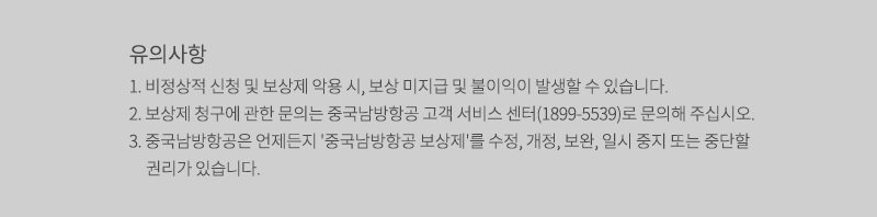 1) 한국에서 출발하는 중국 직항 CZ정규편만 이용이 가능합니다. 2) 예약당일 시스템 상 좌석이 오픈되어 있는 해당일에 한하여 이용이 가능합니다. 3) 수수료 200CNY(약 34,000KRW)를 포함한 TAX 및 유류할증료 결제와 동시에 발권됩니다. 4) 마일리지 적립, 발권 후 노선 및 일정 변경, 현금으로의 교환은 불가합니다. 5) 보상 항공권 발권 후 승객 개인 사유로 인한 환불 시, 수수료를 제외한 TAX 및 유류할증료에 대한 금액만 환불이 가능합니다.