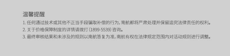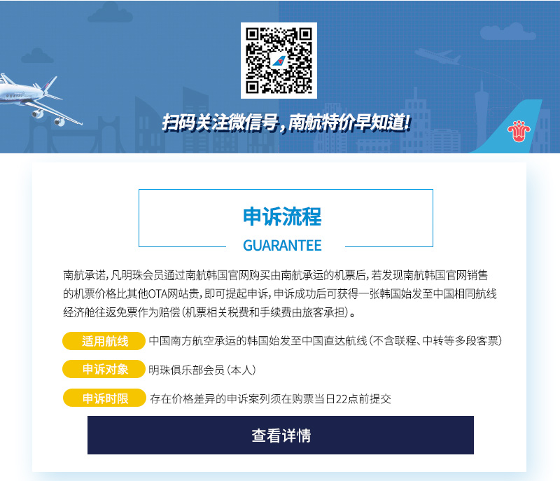 存在价格差异的申诉案例须在购票当日22点前到(selczmarketing@csair.com)提交。详细活动规则请参考页面下方。 ∙ 乘机人南航明珠会员号 ∙ 票号(784开头的13位数字) ∙ 南航韩国官网已支付订单截图 ∙ 比南航韩国官网低票价的其他网站地址 ∙ 其他网站和南航韩国官网相等条件的清晰截图:含航班、航程、舱位(子舱位)、价格、下单时间、平台代理信息等 申诉成功后5个工作日左右通知申诉情况。 <免费机票使用规则> ∙免费机票赠送信息将在旅客申诉成功并完成出行后的10个工作日内发放至乘机人电子邮箱。 <使用规则> 1)适用于从仁川/金铺/清州/釜山/济州机场始发至中国,且由南航实际承运的直达航班。 2)免票在预约旅行日期时需对应订座舱位为开放状态,否则需更换日期出票。 3)免票兑换时相关的手续费(200CNY/34000KRW)及其他税、燃油附加费等需旅客自行支付。 4)免票不可兑换现金,不可累积里程、更改航程和日期。 5)出票后发生任何自愿退款时,仅退其他税、燃油附加费(不含手续费)。