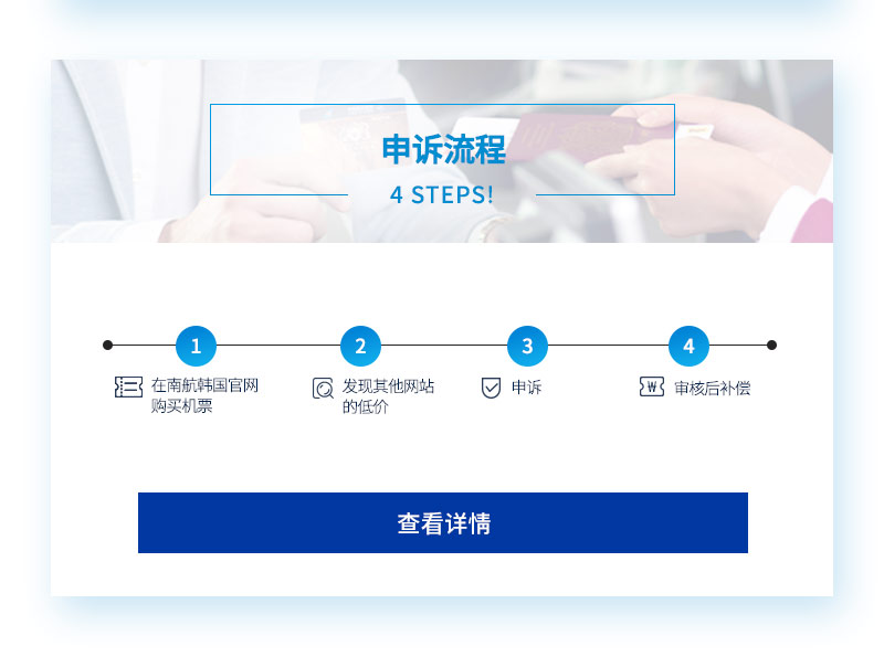 1. 明珠会员通过南航韩国官网购买由南航承运的机票,如发现南航韩国官网的客票价格高于其他网站,即可申诉。 2. 申诉的适用条件 ∙ 发现南航韩国官网的客票价格高于其他韩国旅行社网站,即可申诉。 ∙ 对比的两张机票,航班号、航班日期、子舱位(如W舱、Y舱等)、航段、航程必须一致。 ∙ 对比的两张机票支付条件必须一致,不含信用卡折扣优惠或其他优惠券的成人票。 ∙ 用于对比的机票,需提供可支付状态或已支付状态的订单信息。 3. 以下情形不享受补偿 ∙ 仅适用于南航韩国官网与韩国国内销售旅行社网站之间的比价,不适用于国外旅行社网站销售机票(e.g. Go to gate, Trip.com, Expedia等)的比价。 ∙ 不适用于国内旅行社信用卡优惠或优惠券使用机票 ∙ 旅客提供的截图无法清晰辨认 ∙ 不适用于当天始发航班的机票 ∙ 汇率存在差异原因的申诉 4. 审核通过的案例,在客票完全使用后,提供韩-中航线经济舱往返免票。 5. 客票须完全使用后方可获得补偿,使用的客票应确保航班号、航班时间与申诉的客票信息一致。 6. 若原客票航班发生非自愿退改,请在原计划起飞时间后5天内联系南航客服申请。补偿规则