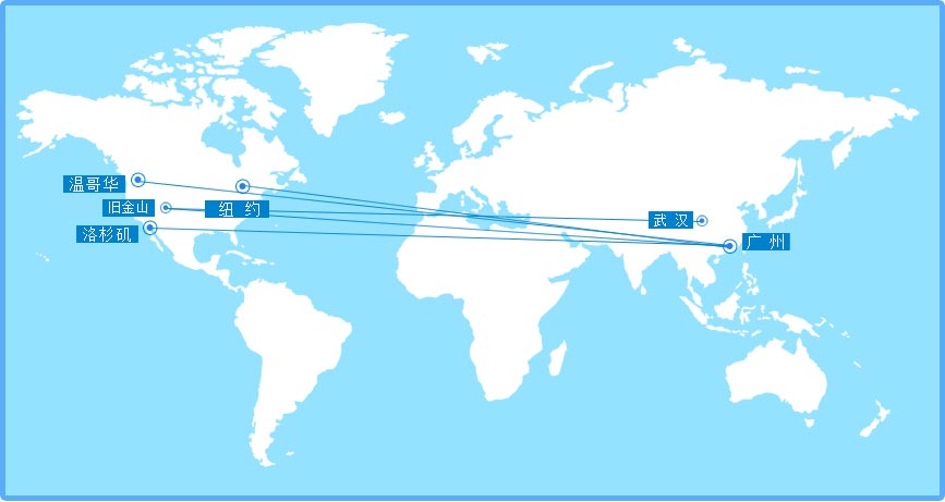 广州-旧金山、广州-洛杉矶、广州-纽约、广州-温哥华、武汉-旧金山