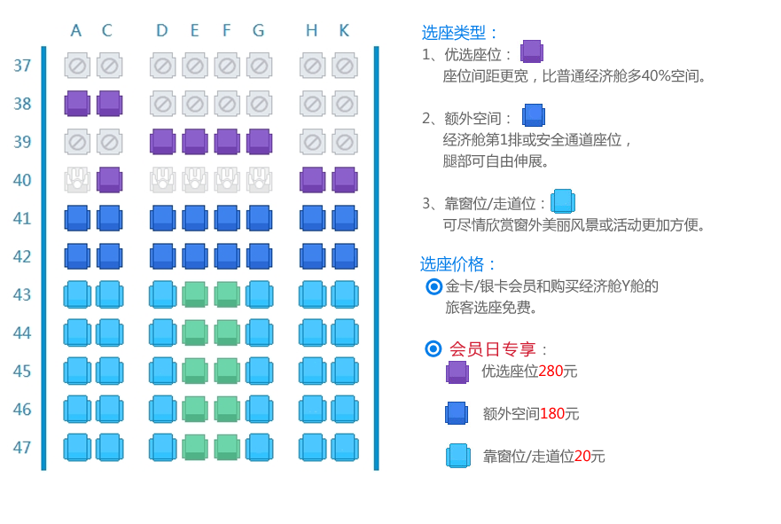 网上选座区域共3类,分别是优选座位、额外空间和靠窗/走道座位,具体区域和价格见图中示例: