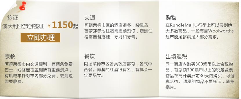 阿德莱德位于澳洲大陆南端,是南澳洲的首府,也是著名旅游胜地。市区内有许多保存完善的历史悠久的建筑物,整个市中心被公园绿地包围,非常适宜居住。阿德莱德周围被无数个著名的葡萄酿酒场环绕,出产澳大利