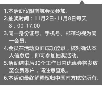 活动内容:活动期间,会员登录南航官网活动页面即可参加抽奖,赢取最高1000元现金优惠券等