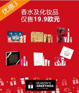 香水及化妆品仅售19.9欧元,精选食品、酒类及糖果点心最高可享7折优惠,节日美食期待您的青睐! 礼品套装与香水享同一价格,赶快带回家吧!