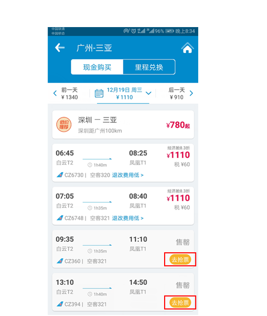 南航将根据后台监测到的扣款顺序进行排序,客服专员将与前三名抢票成功的旅客联系。