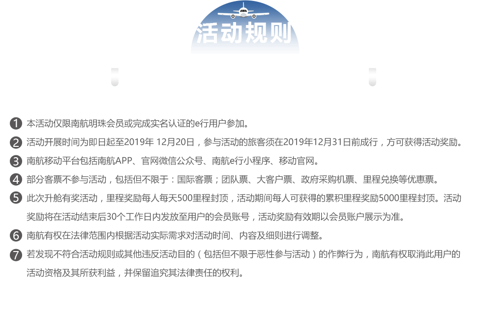 活动期间,南航明珠会员或完成实名认证的南航e行用户报名参与活动,在南航移动平台为本人及同行人成功办理自助升舱,并在12月31日前成功出行,就有机会获得99~5000里程大奖。
