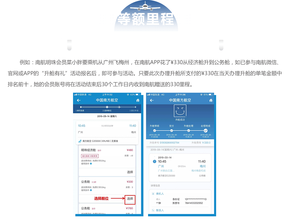 2、在南航APP、南航微信公众号、南航e行小程序办理自助升舱的旅客可以享受上述所有权益,其他渠道办理的升舱请以实际产品规则为准。