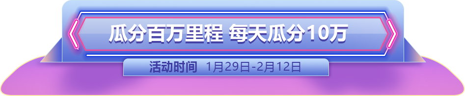 1月29日-2月7日期间每日零点起瓜分10万里程,最高可抢500里程;