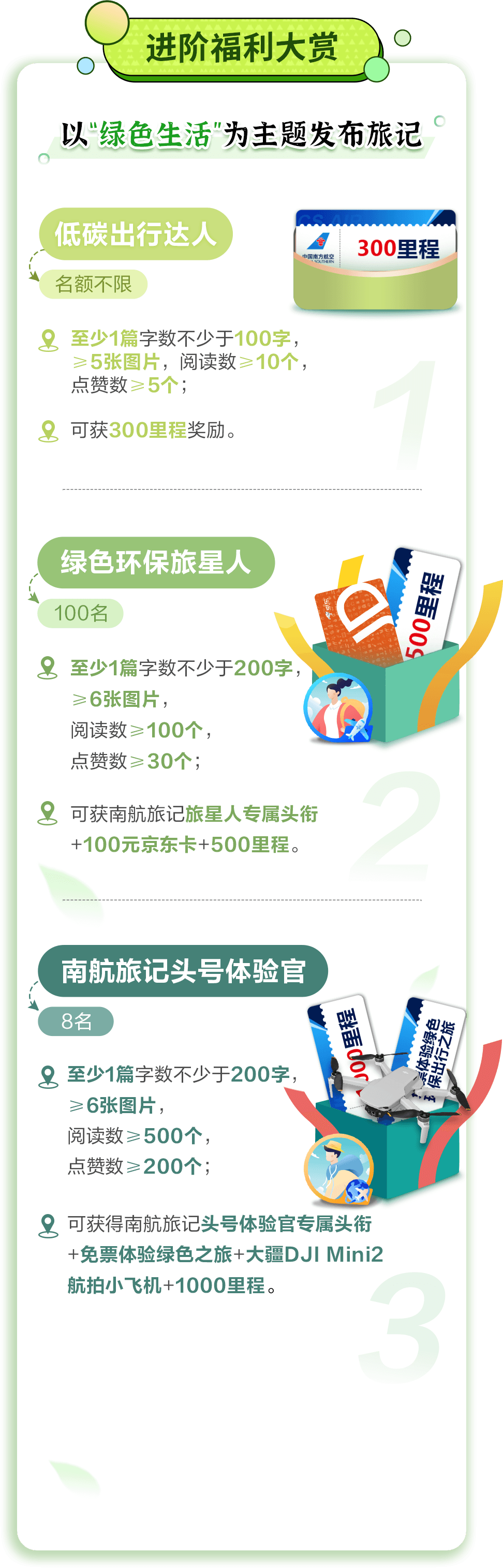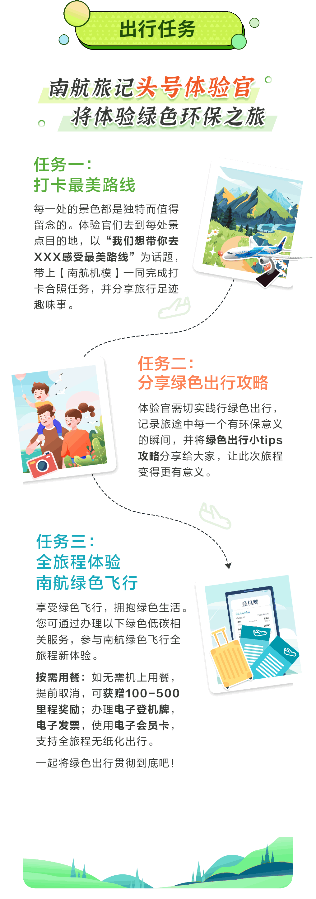 1、进入【南航旅记】话题活动,发布分享绿色生活或绿色出行体验旅记(如:分享绿色健康有机美食、绿色健康低碳出行体验、绿色环保生活方式体验等等)。