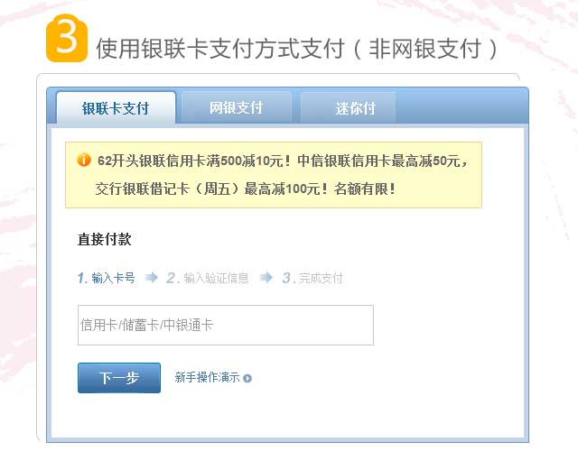 11月28日,使用银联信用卡(卡号以62开头,卡面有银联标识)在南航官网购买国内机票,并通过银联在线支付通道支付,即有机会获得额外9折优惠,最高直减62元,限当日前2800单,数量有限,先到先得噢!