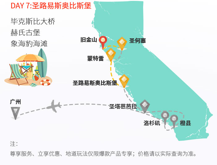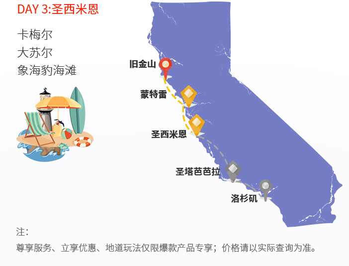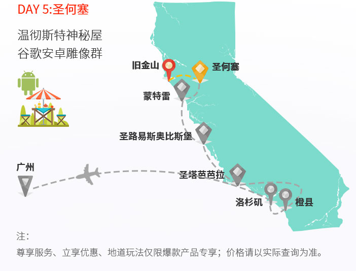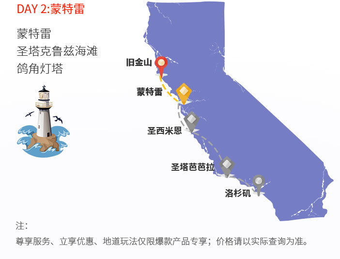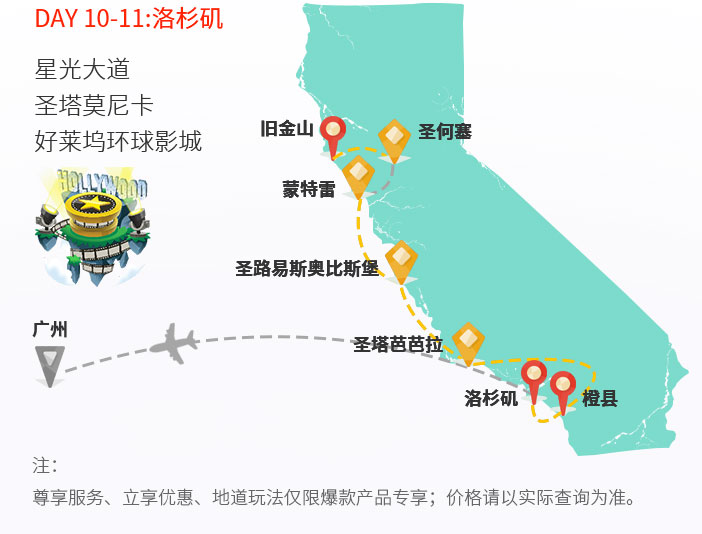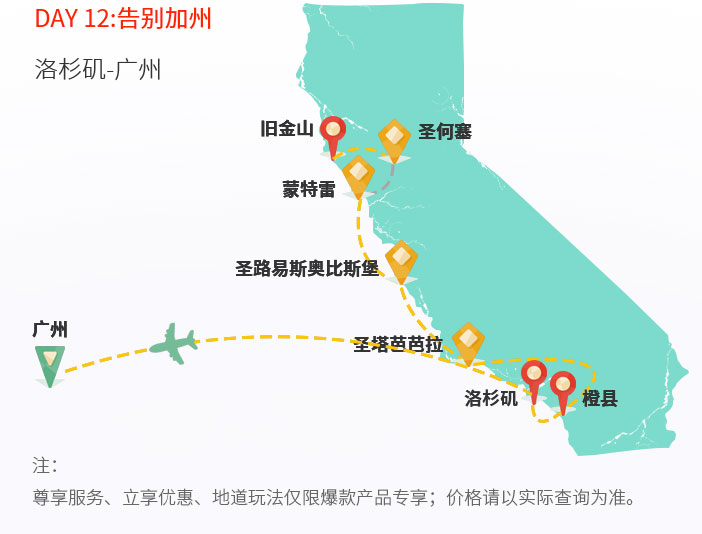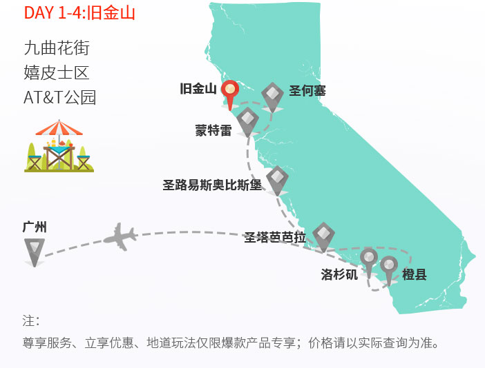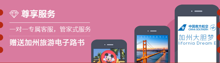 含税往返机票+3晚旧金山酒店+1晚洛杉矶酒店+专属客服+电子路书+旅游局官方推荐+免费升级定制服务