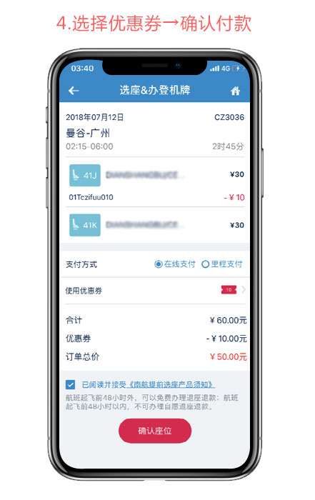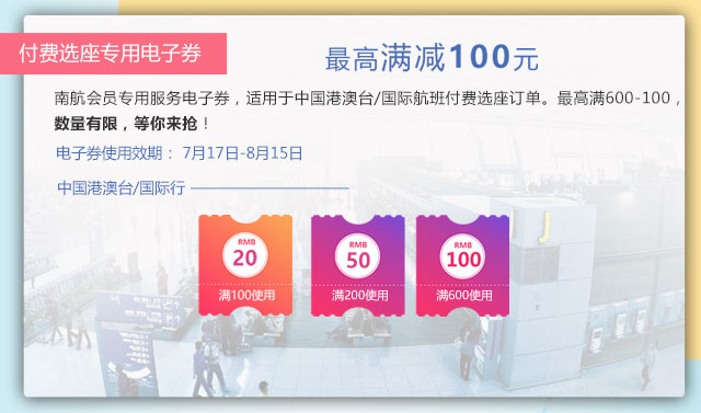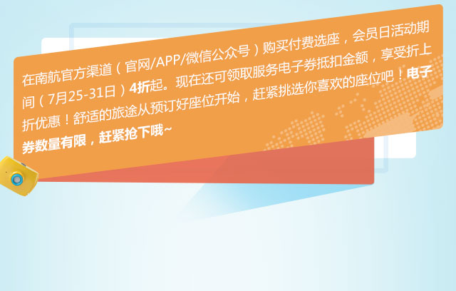7月25日-7月31日活动期间,通过南航官网购买国际付费座位服务,部分可享4-6折优惠。