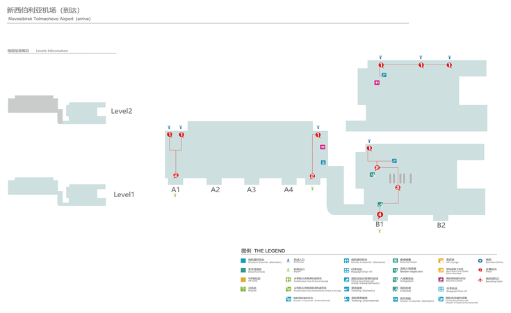 一层:出发层、到达层。出发旅客办理值机手续;到达旅客办理边防、行李提取、海关、检验检疫手续。在出发区域有机场餐饮休息区。