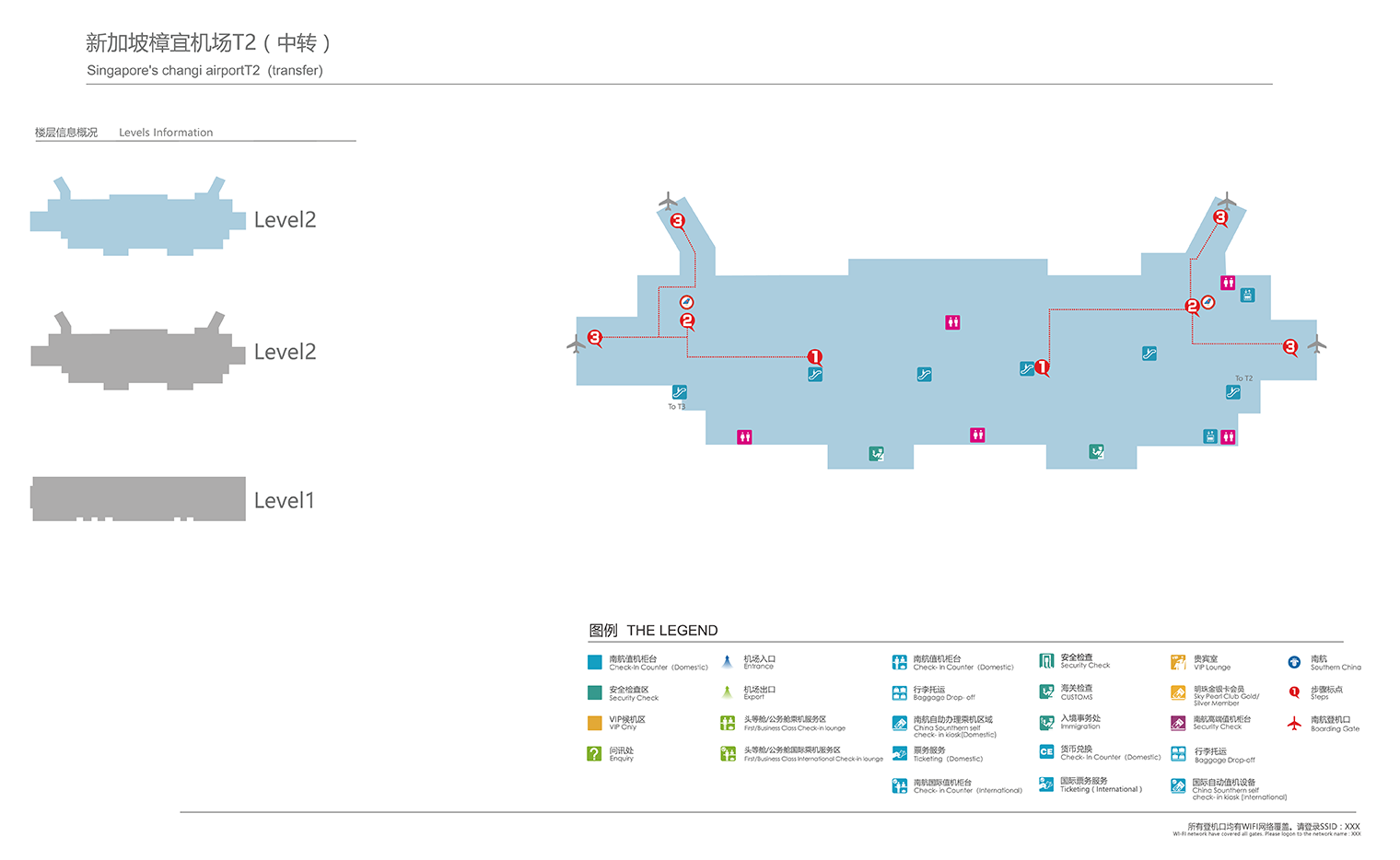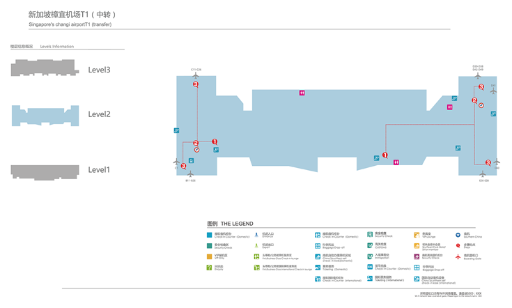 樟宜机场设施完善,为等候离境与转机的旅客提供从休闲,餐饮至购物等的多样选择。机场设有免费饮水机,为旅客免费提供饮用水。机场有WiFi覆盖,免费为旅客提供上网服务,出境厅内还设有电脑共旅客免费上网。