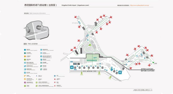 悉尼国际机场(Kingsford Smith Airport,三字代码:SYD)是澳大利亚最大最繁忙的国际机场,距市中心8公里。机场內设有三个航站楼,其中1号航站楼(T1)为国际航站楼,2号和3号(T2、T3)为国内航站楼。