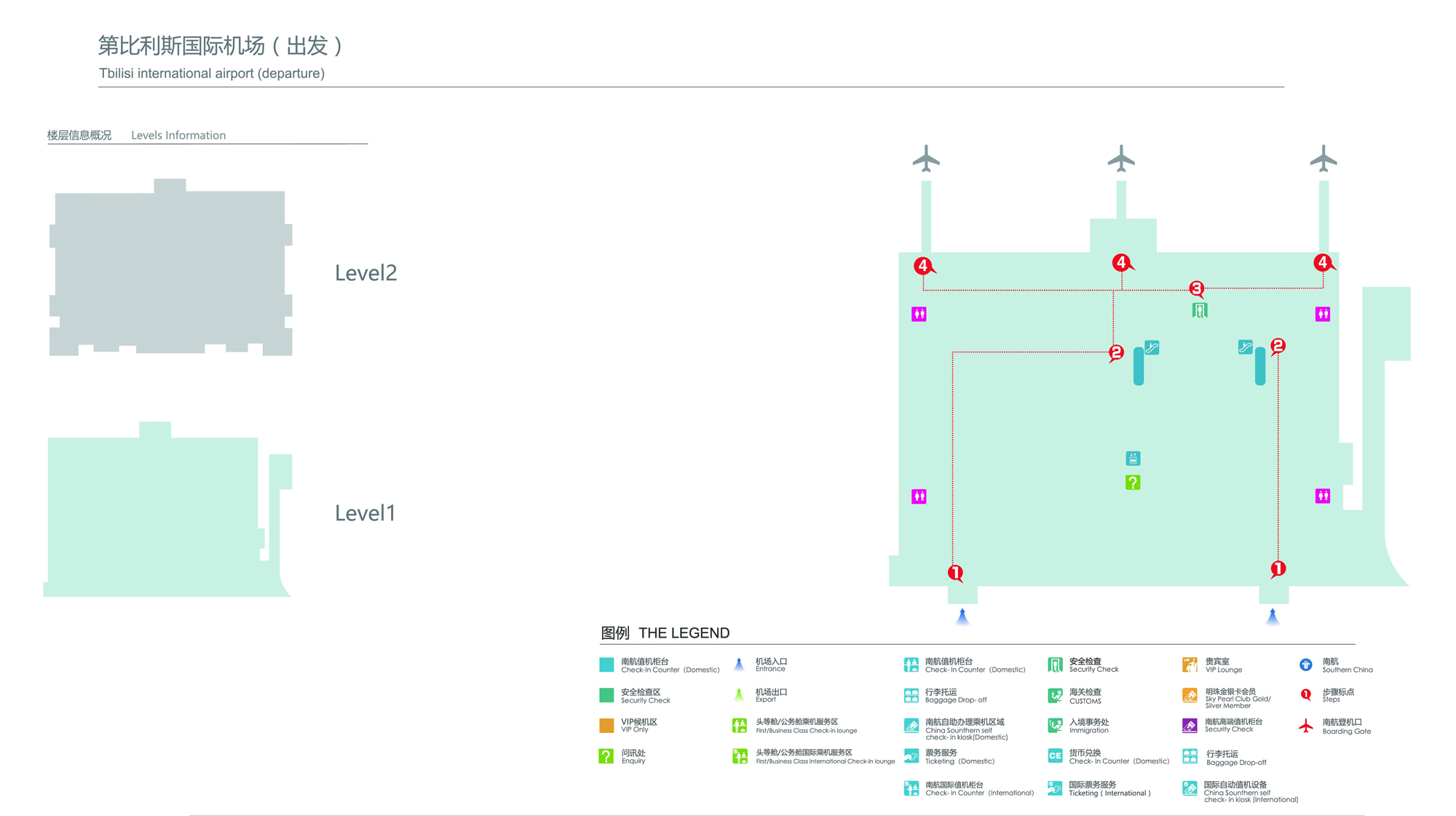 二层:出发层。出发旅客边防、安检手续,候机厅。有机场餐饮休息区,免税店。航空公司办公区域