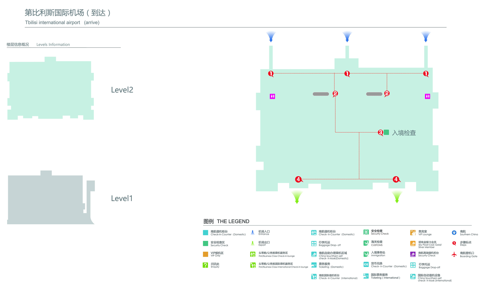一层:出发层、到达层。出发旅客旅客在该层办理海关检查、办理值机手续;到达旅客行李提取大厅,办理海关、检验检疫、边防、安检手续。在出发区域有机场餐饮休息区。