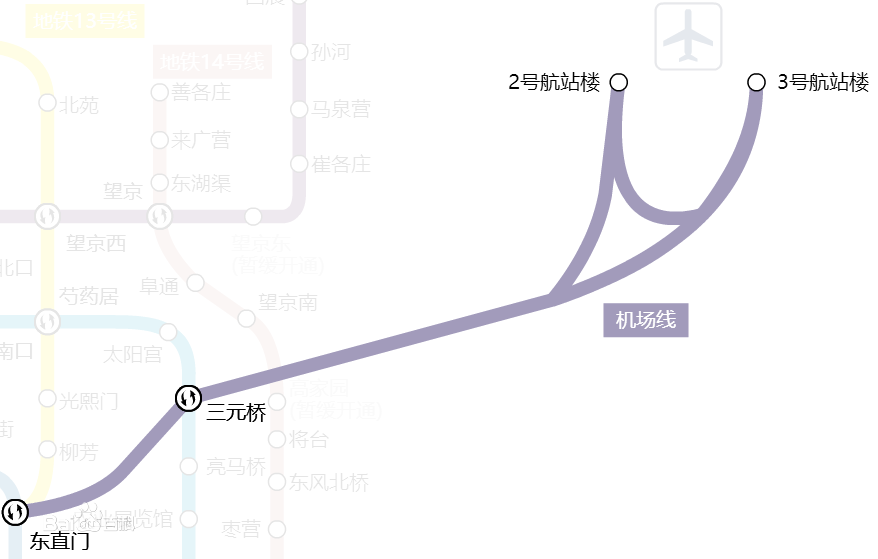 机场快线共设T2航站楼、T3航站楼、三元桥、东直门四个站点。其中,三元桥站可换乘10号线,东直门站可换乘2号线和13号线。