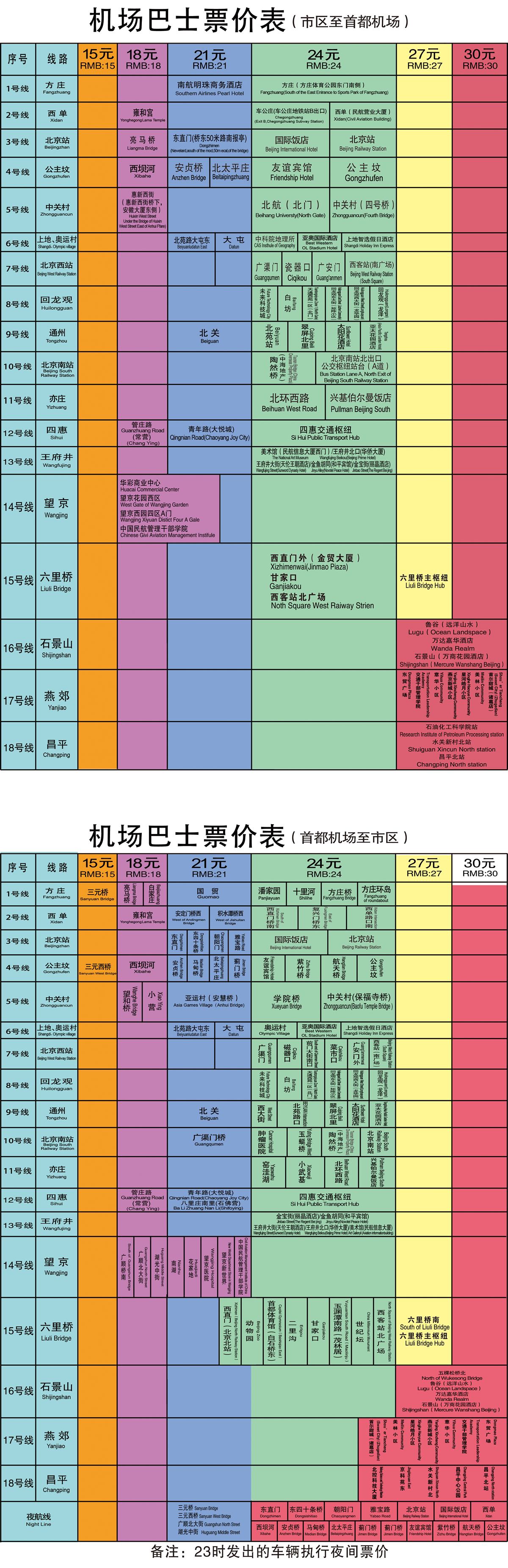 对以上票价规定还不清楚?举个例子:如从首都机场前往国贸,按第2个表,应乘坐市区大巴1号方庄线,对应的票价是21元。