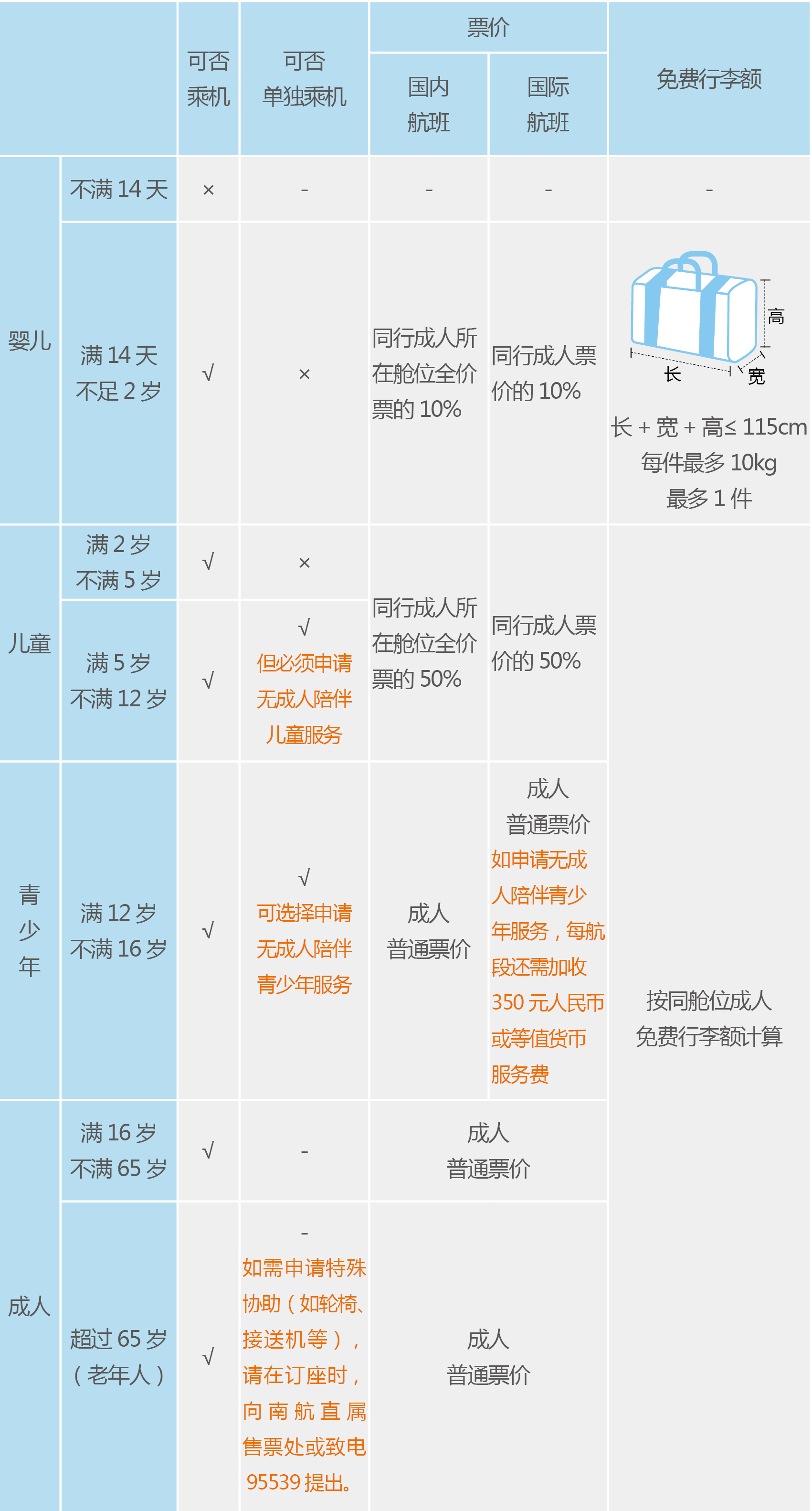2、婴儿不单独占座位。但每一个成人只能有一个婴儿享受以上票价,超过限额的婴儿按相应的儿童票价计收,可单独占一座位及享受相应免费行李额。