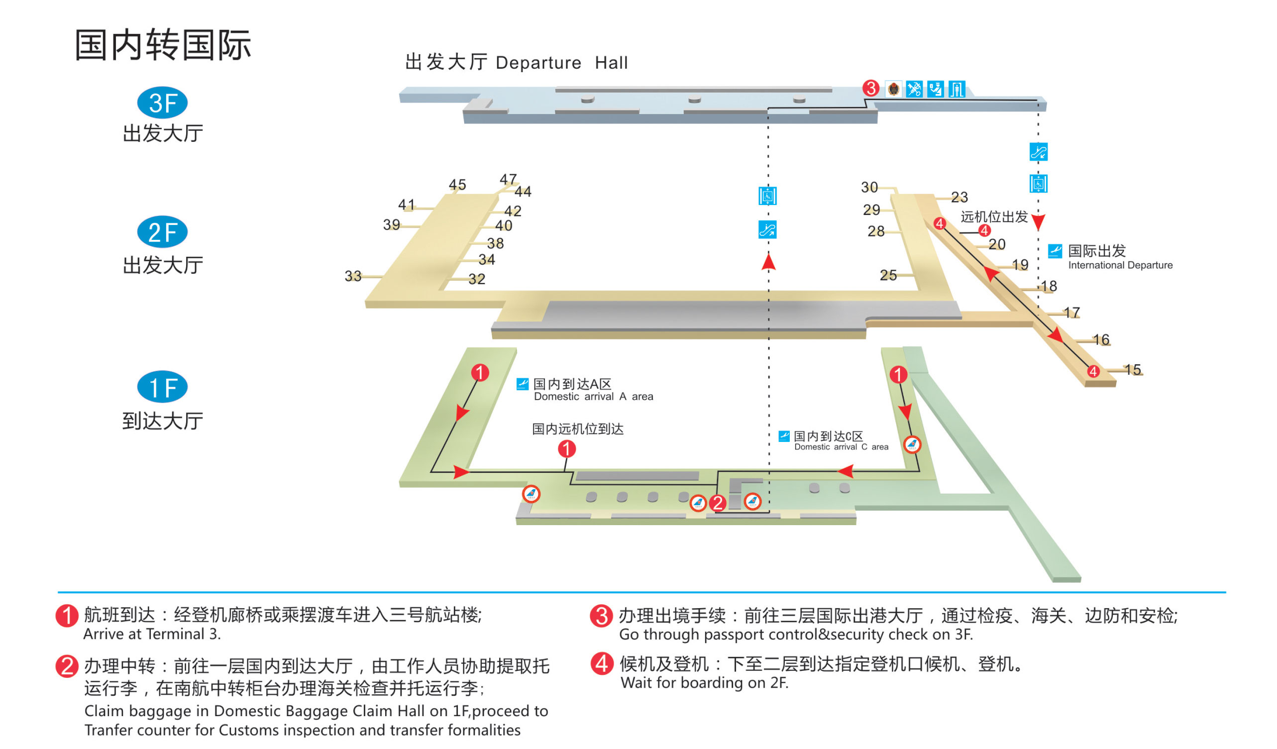 购买了南航联程客票,并已在始发城市办理了“一票到底”的旅客,下机后直接前往三层D区国际出发大厅乘机即可,无需提取行李,也无需前往C岛国际值机柜台办理乘机手续。