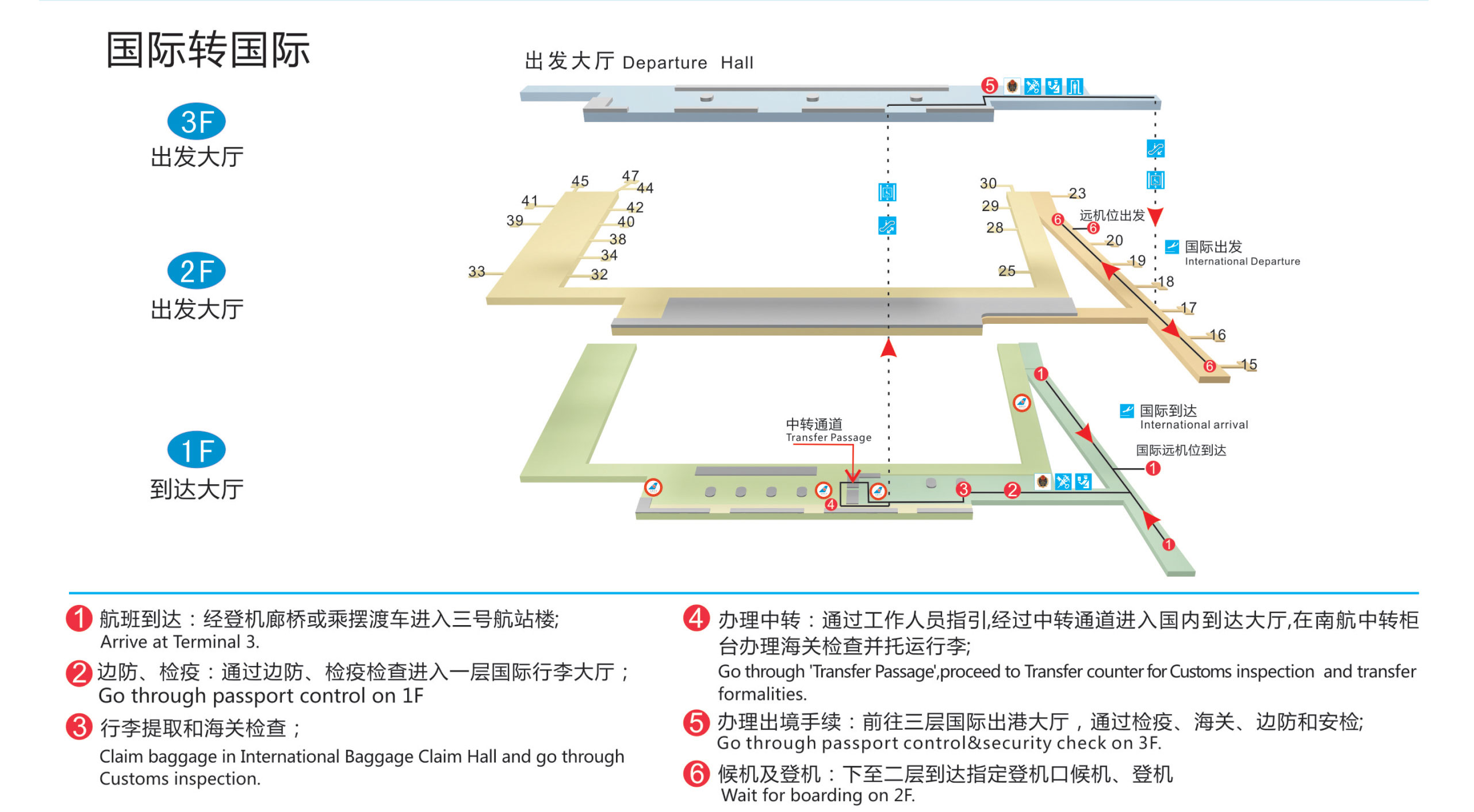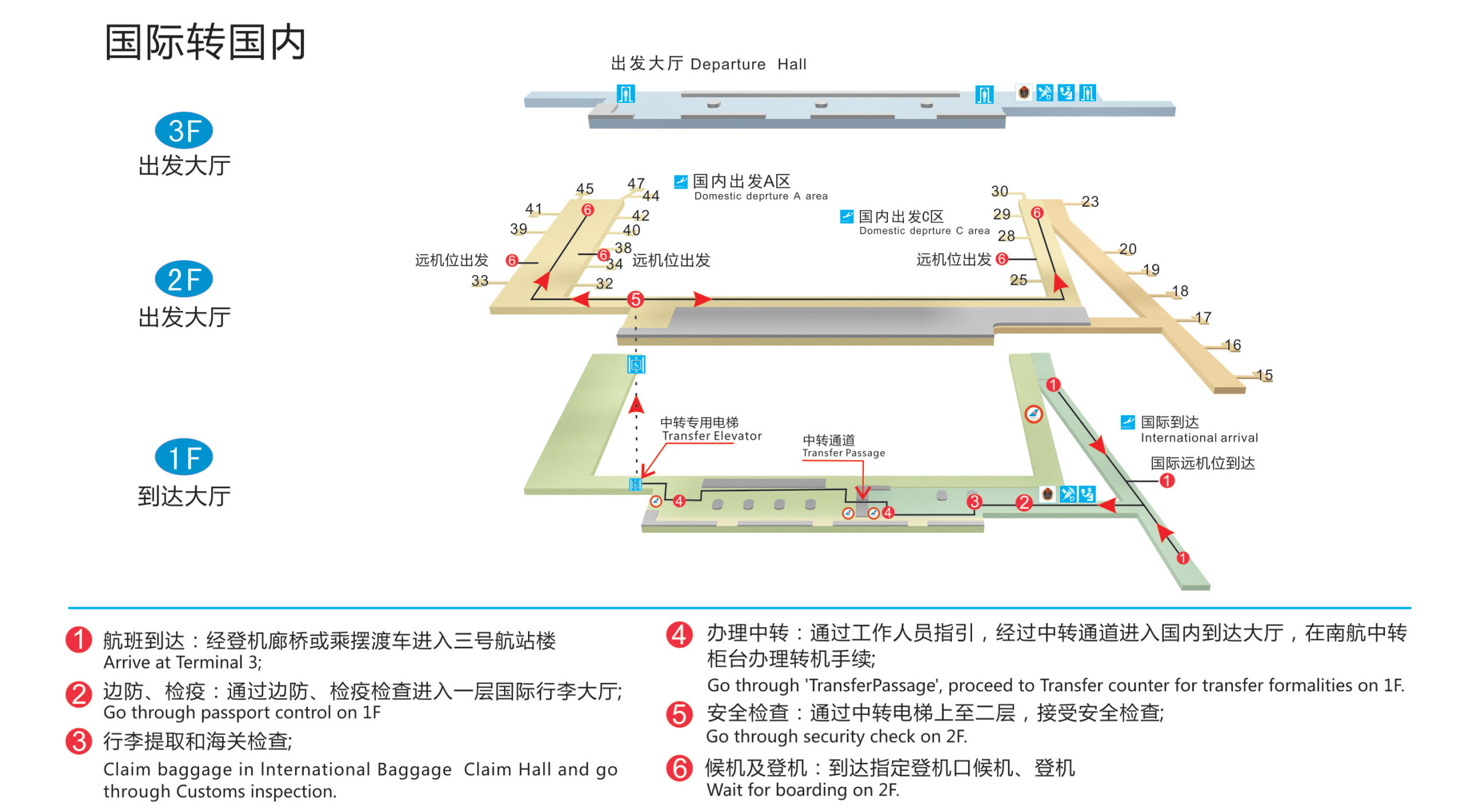 下机→检疫、边防检查→提取行李→海关、检疫检查→前往二层中转柜台或三层值机柜台办理转乘手续→安全检查→前往指定登机口候机