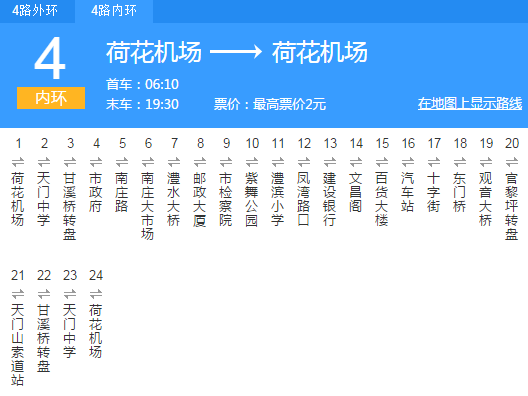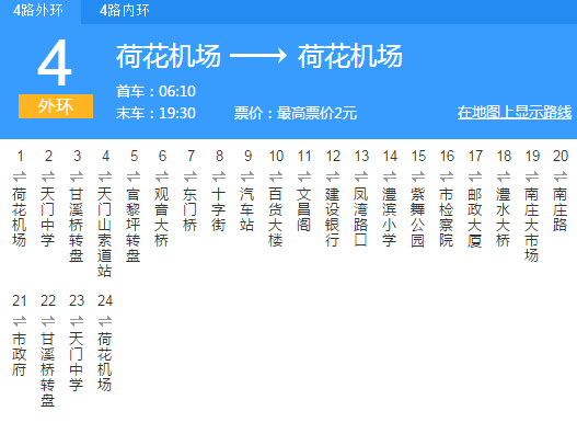 4路公交车的候车点就位于机场大门口前100米处,为环城线路,分“内环”和“外环”两条线: