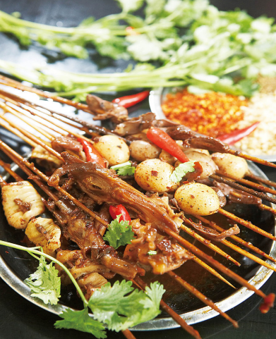 串串分为热锅串串、冷锅串串、砂锅串串等多种口味,食客各自选好菜后自己围坐一口锅,将食材经红油汤底涮过之后蘸以辣椒调料食用,跟火锅一样,只是锅中的多出了一大把竹签。一入口立觉麻辣满腔,香味四溢,是成都著名美食小吃。