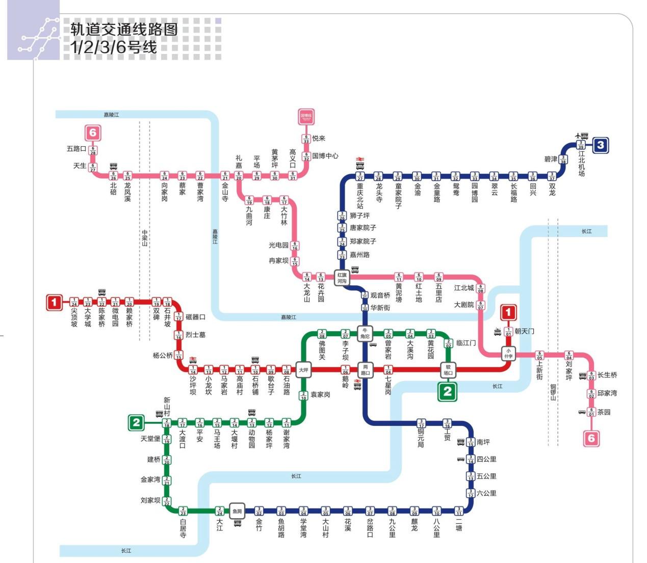 重庆地铁目前设有1、2、3、6号四条线,几乎覆盖了所有景点和车站,非常方便。起步价2元,最高7元,方便起见可以办理重庆交通卡。城区的重要景点都集中在1、2号线沿线。