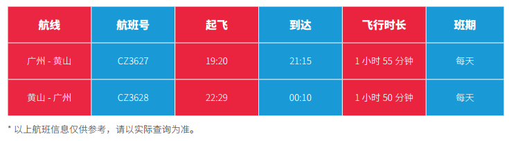 黄山屯溪机场是皖浙赣周边地区唯一的国际机场,除国内各大城市之外,还开通至首尔、釜山、台北等城市的航班。目前,中国南方航空已开通从广州直飞黄山的航班,具体航班信息如下: