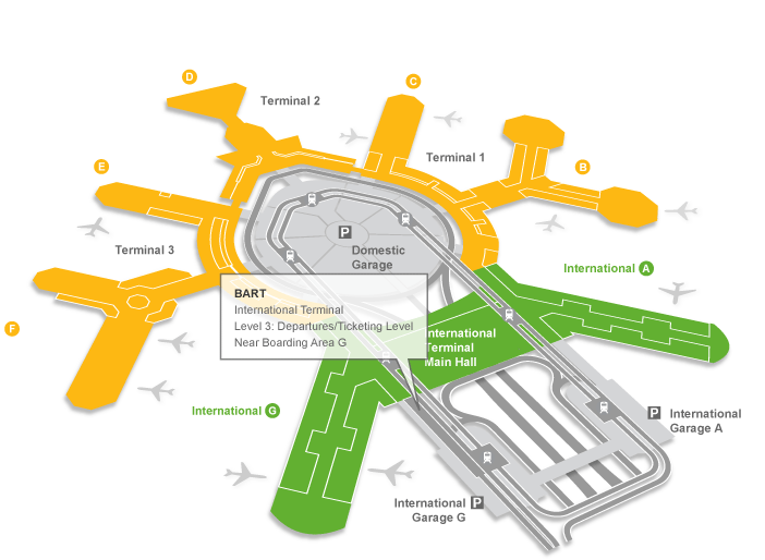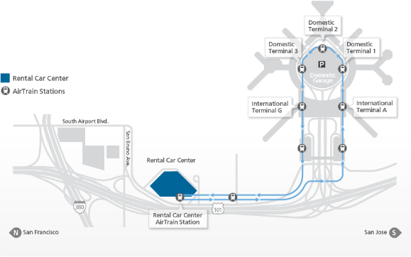 旧金山市区内的地铁叫做MUNI,旧金山湾区的地铁叫做BART。旧金山国际机场是BART地铁途经站点之一,搭乘地铁往返旧金山市区、东湾East Bay、圣马特奥县 San Mateo County(硅谷里)十分方便。