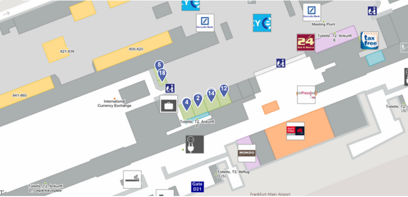 法兰克福机场周边的酒店大多提供机场穿梭大巴服务,请提前与预订酒店联系。候车点在T1航站楼A区一层(到达层)、T2航站楼D/E区二层(到达层)。