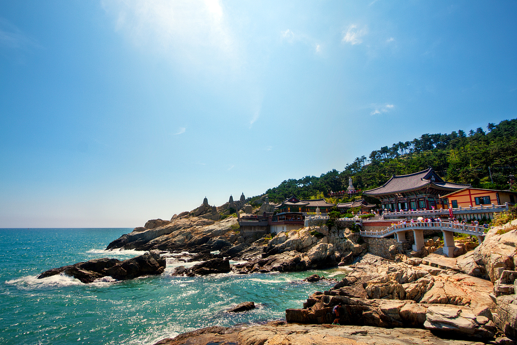 海云台是韩国的第一大海水浴场,釜山国际电影节的举办地,拥有得天独厚的地理位置和天然风光,海水很清澈,号称韩国最美的浴场,平时还有街头艺人会在此表演。