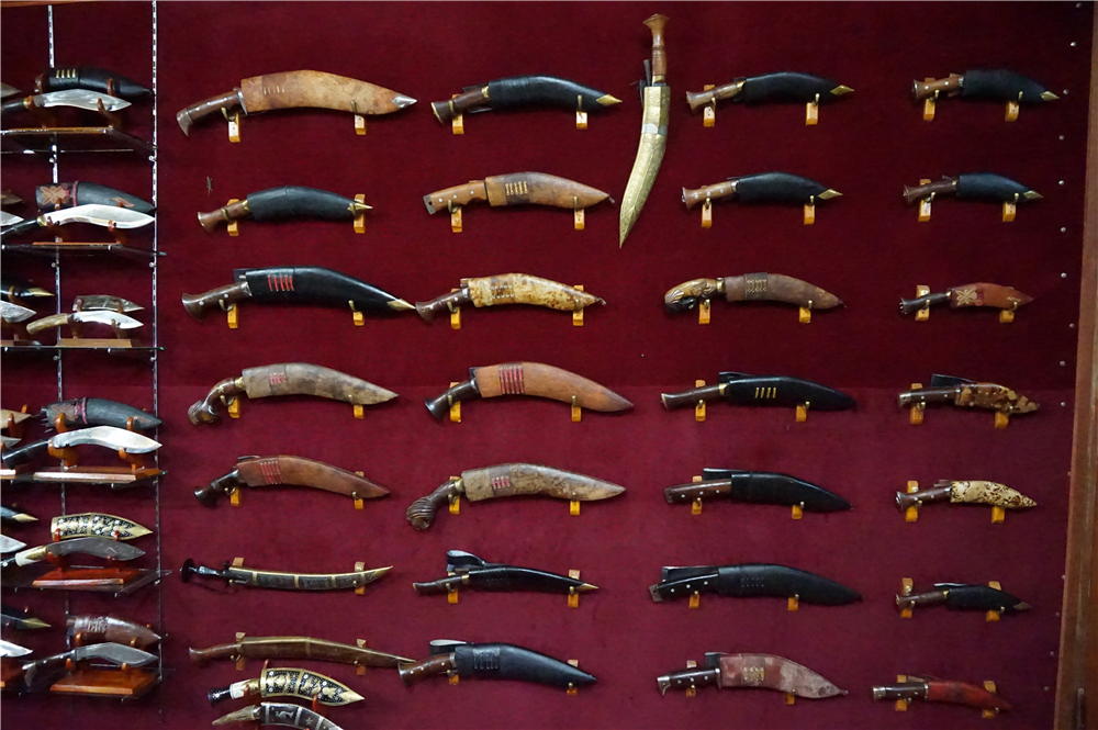 尼泊尔山区的人们有一个习惯,即常会将弯刀佩戴在身上。这种弯刀被称为“廓尔喀刀”,其造型别致、工艺精湛,是尼泊尔的特色商品之一。弯刀的价格决定于它的工艺和镶嵌饰物,在尼泊尔的大街小巷,随处可见贩卖廓尔喀刀的小摊儿,但品质良莠不齐,一定要仔细辨别。